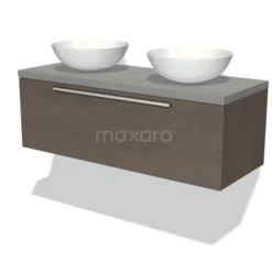 Dankzij het prachtige design is dit badkamermeubel de eyecatcher van uw badkamer. De donkerbruin eiken onderkast heeft een warme uitstraling en is voorzien van een wastafelblad in lichtgrijs beton. Daarnaast beschikt het meubel over een vlak front voor een tijdloze touch. De handgreep dient u zelf toe te voegen. Deze is verkrijgbaar in verschillende kleuren en vormen.