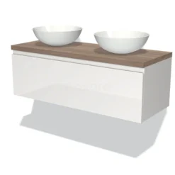 Dankzij het prachtige design is dit badkamermeubel de eyecatcher van uw badkamer. De hoogglans witte onderkast heeft een moderne uitstraling en is voorzien van een wastafelblad in middenbruin eiken. Daarnaast beschikt het meubel over een greeploos front voor een strakke touch.