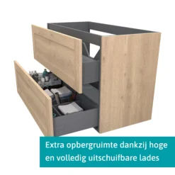 De onderkast is uitgerust met 1 lade, waarin u plaats heeft voor al uw badkamerspullen. Door het systeem met softopen en -close opent en sluit de lade geluidloos. Bovendien is deze extra hoog en volledig uitschuifbaar. Verder heeft het meubel een slimme sifonuitsparing. Hierdoor benut u de beschikbare ruimte optimaal.
