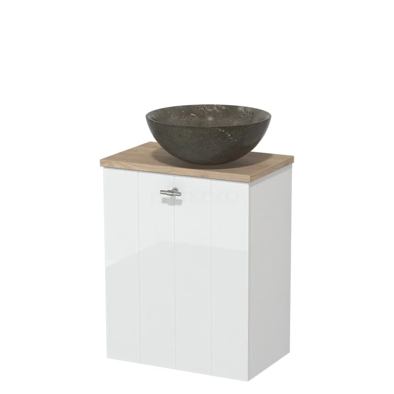 Dankzij het prachtige design is het meubel een blikvanger in de toiletruimte. De onderkast heeft een hoogglans witte afwerking met een lichtbruin eiken wastafelblad.