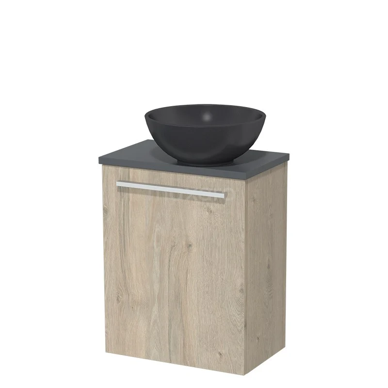 Dankzij het prachtige design is het meubel een blikvanger in de toiletruimte. De onderkast heeft een lichtgrijs eiken afwerking met een donkergrijs wastafelblad.