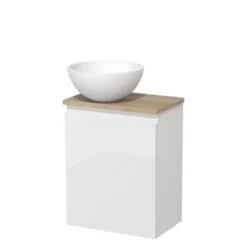 Dankzij het prachtige design is het meubel een blikvanger in de toiletruimte. De onderkast heeft een hoogglans witte afwerking met een lichtbruin eiken wastafelblad.